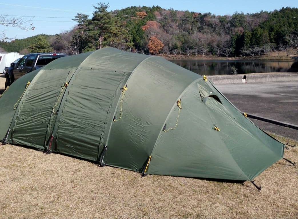 - このテント購入後の毎週末の悪天候で、まだ箱から出して妄想に耽っているだけです。 本当はカマボコテント2のタンが欲しかったのですが、手に入る目処が全く立たない。今回ナチュラム別注の緑モデルを購入した決め手は色でしたが、ただ実物を見るまでは正直多少の不安もありました。その気に成っていた色ですが深緑を思わせるような落ち着きのある緑色で、でもアーミーグリーンのように重たくもなく個人的には好印象でした。でも実際に張ったテントを自然光下で見たら、またちょっと違う印象を受けるかも知れません。 黒のカマボコシールドも一緒に購入しました。このテントの緑に黒は相性が良さそうです。と言うか緑のテントにベージュやタンのシールドは、ちょっとキモくて使えません…。シールドは黒一択です。ちなみに開封するまでシルバーだと思っていましたが、テントポールも黒でした。カマボコテント2のタンやブラックのポールと同じ物みたいですね。ちょっと嬉しい計らいです。 テントの生地ですが、生地は出来るだけ分厚くて頑丈な方が良いのだとは思うけど、でも75Dだって有名メーカーの主流テントと同程度だし、150Dの物より3キロくらい軽いと思えば悪くもないです。と言うか、この75Dのカマボコテントでも結構重たいです。テント収納袋が大きくて、更に袋の持ち手が妙に長くて力を入れ難い…。ハンドバッグのように持ってもトートバッグのように肩に掛けても、実際の重量以上に重たく感じます。この収納袋と袋の持ち手は改善して欲しいな。 話は変わるけどナチュラム別注モデルは150Dは勿論、まだ在庫のある緑75Dも定価以上で早速転売されてます。相変わらず転売ヤーにスゴい人気ですね。自分でカマボコテントを買っといてなんだけど、定価より高いお金を出す程のテントではない気がしますが…。