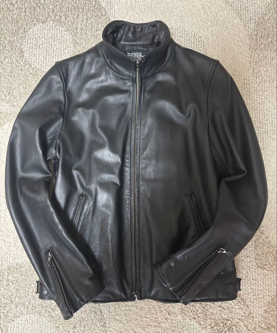 【アイテム】\r美品 schott ショット 641 SINGLE RIDERS シングルライダースジャケット 36 ブラック 黒 BLK スタンドカラー レザー ライダース ジャケット レザージャケット 本革 ブラック 黒 アウター メンズ レディース ユニセックス バイク ツーリング ライディング ブルゾン 革 高級 かっこいい ファスナー フルジップ 高級レザー ハイクオリティ USA製 アメリカ製 立ち襟【サイズ】\r表記36《平置き採寸》約㎝肩幅43身幅49袖丈56着丈62\r裄丈82.5\r【状態】\rボアライナー付属していません。目立った汚れやダメージありません。画像にてご確認をよろしくお願いいたします。神経質な方のご購入はご遠慮下さいませ。 \r【カラー】\r黒 ブラック \r\r【注意点】*撮影の反射などでの若干の色の差異はご了承ください。*寸法にて、若干の誤差はあるかもしれませんがご了承ください。*ご購入後のクレームは対応しかねますのでしっかりとご理解した上でのご購入をお願いいたします(こちらの不備などによる場合は返品対応をとらせていただきます)*保管上または梱包でのシワはご容赦下さい。*確認は人間がおこなっている為、汚れ等の見落としはご容赦下さいませ。*あくまでUSED品の為、神経質な方やリユース品にご理解の無い方のご購入はお控え下さい。*不明な点がありましたらお気軽に、ご質問下さい。よろしくお願いします。