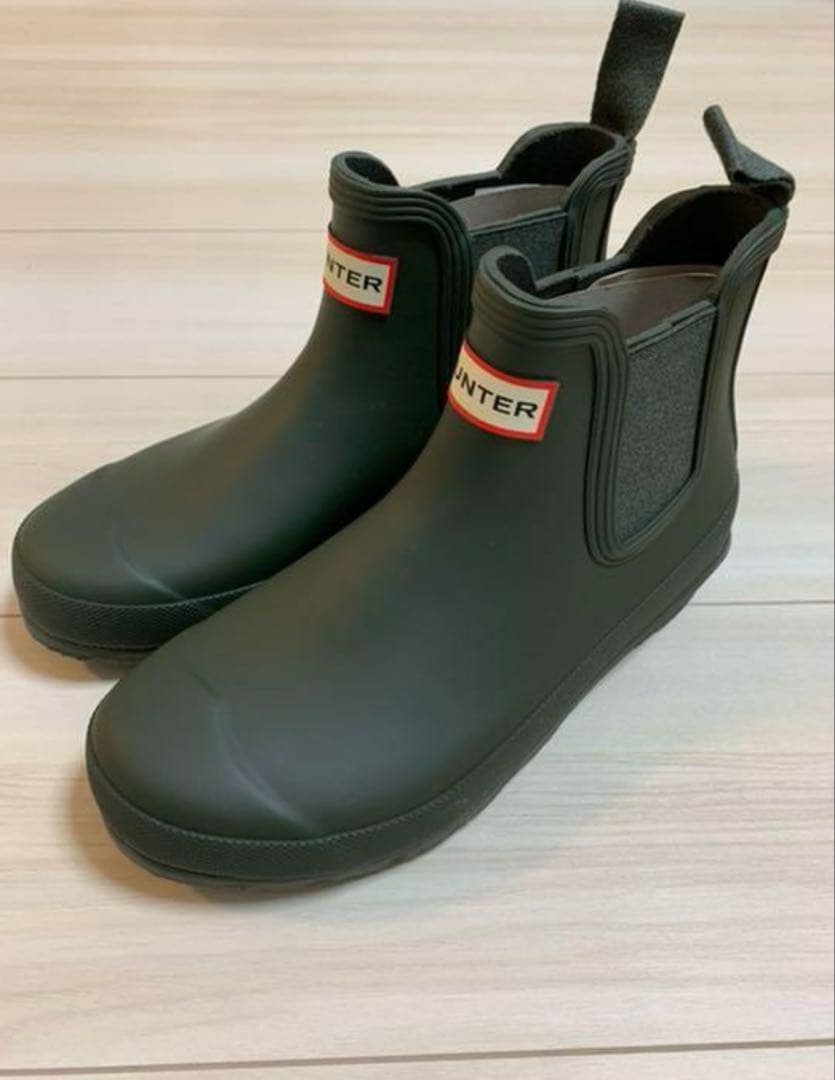 先月、HUNTERのオンラインショップで購入しました。新品、未履用です。家で保管していたので気になる方はご遠慮下さい。送る際は簡易梱包させて頂きます。レディース オリジナル チェルシー ブーツ ブラックサイズー24cmブーツの高さ(ヒール除く)ー13cmヒールの高さー3cm雨に強いハンターのチェルシーブーツは、天然ゴムを使用し手作業で作られ、優れた保護性能を発揮する加硫加工が施されています。伝統的なチェルシーブーツのアイコニックな特徴はそのままに、伸縮性のあるマチとナイロンのプルタブで履きやすくなっています。ハンターオリジナルのトレッドパターンと快適な100%リサイクルポリエステルの裏地が、この100%防水ブーツのデザインを完成させています。