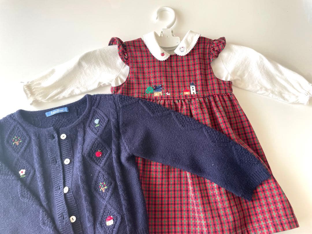 - カラーも柄も超可愛い!!です。スカートも三段重ねになっていて、裏地もちゃんとあるので着用したらふんわりして女の子らしくなるんだろうなぁ〜と今から着せるのが楽しみです